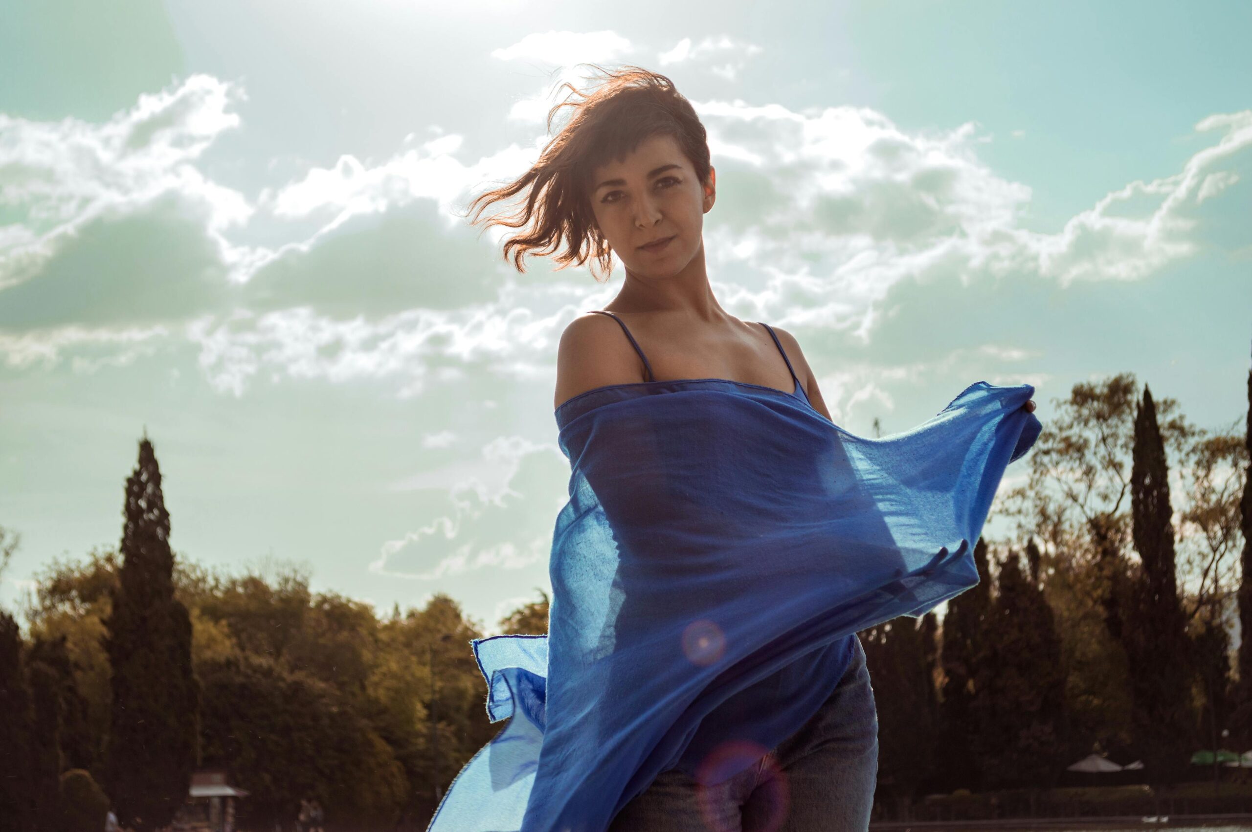 insert_image(‘cloudy sky, spring morning, woman walking, urban park’)